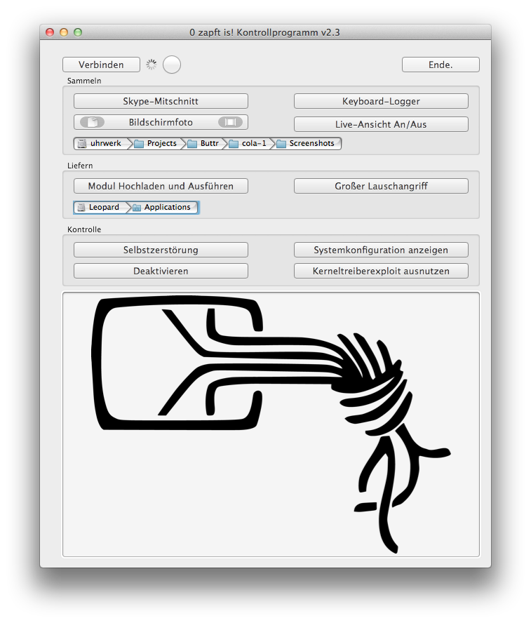 Der CCC hat für die Scheunentor-API des Trojaners ein GUI geschrieben, das wir mal in einem kurzen Video vorstellen werden. Die Antivirenhersteller haben inzwischen Kopien des Trojaners erhalten und sollten ihn ab morgen früh erkennen und entfernen können, zumal keine Rootkit-übliche Tarnfunktionalität in dem Kernelmodul implementiert war. Aber macht euch keine Sorgen, wir haben den Behörden rechtzeitig Bescheid gegeben, dass sie noch schnell den Selbstzerstörungsknopf drücken können.