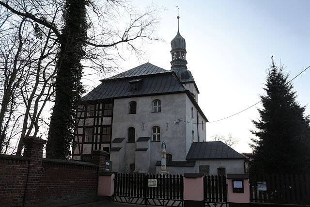 Polski: Stare Drzewce, kościół ewangelicki, ob. rzym.-kat. par. p.w. bł. Szymona z Lipnicy, XVII